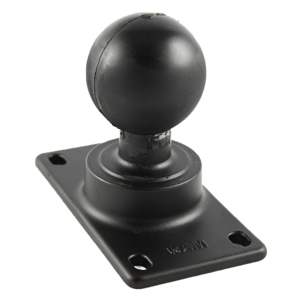 The RAM-D-243U consists of a 2.25" diameter rubber ball, connected at right angles to a square 2.81" x 5" plate.