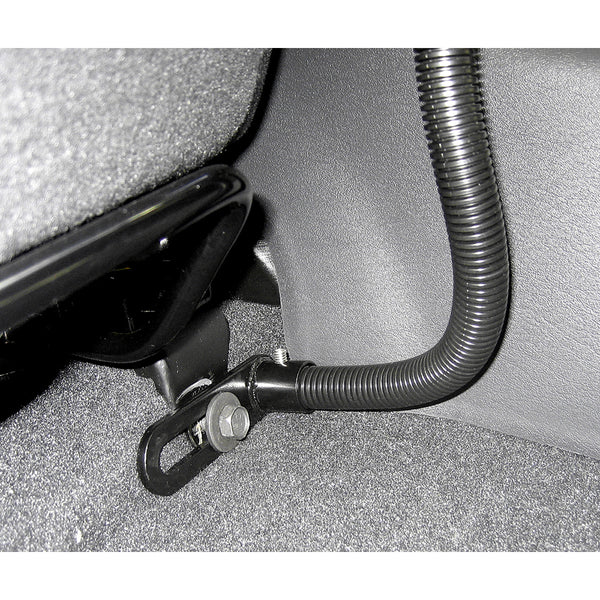 The RAM-316-3SW1U consists of the RAM POD III No-Drill vehicle base, three rigid aluminum rod legs, ratchet swing arm and RAM Tough-Tray. The base of the mount connects to your seat rail without any drilling necessary. The rigid aluminum rod legs can be bent to position your device to its optimum viewing location. The mount is designed with a RAM 1.5" diameter patented rubber ball and socket system that has adjustment points at both ends of the double socket arm; this allowing for almost infinite adjustment and perfect viewing angles.