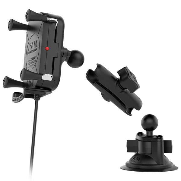 The RAM® Tough-Charge™ with X-Grip® Technology is the world's first patented, universal waterproof wireless charging cradle for phones. Designed with spring-loaded RAM® X-Grip® Technology, this cradle features an 'X' design that expands and contracts to secure nearly any phone while taking advantage of Qi wireless phone charging. All four arms feature rubber-coated caps that hold your phone firmly in place, and the open design keeps buttons and switches accessible on the sides of phones. To insert your device, simply squeeze the arms on one side of the cradle and place your phone inside before releasing the arms. This Qi wireless charging cradle ensures your compatible phone charges no matter what position it’s placed at. For added security and peace of mind, a device tether is included that’s recommended for outdoor applications. In addition, a support leg can be adjusted to the ideal position or removed altogether. This RAM® Tough-Charge™ with X-Grip® Technology wireless charging suction cup kit includes a B size diamond base featuring a 1” rubber ball, medium length double socket arm, and RAM® Twist-Lock™ suction cup. The connected Type-A male pigtail connector features an in-line switch that allows you to turn off the wireless charging module when not in use. For in-vehicle charging, attach the pigtail to the included 1.2m Type-A male to Type-A female extension cable.
