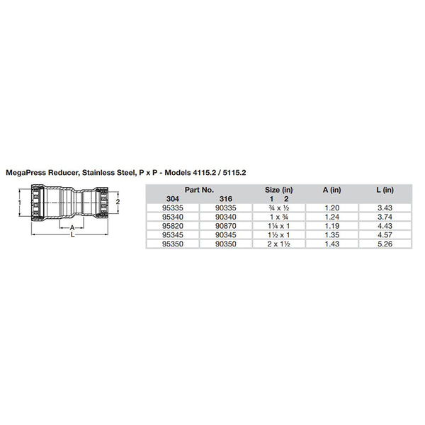 MegaPress 1-1/2" x 1" Stainless Steel 304 Reducer - Double Press Connection - Smart Connect Technology